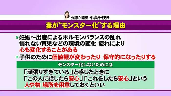 公認心理師の小高千枝氏は、妻が“モンスター化”する理由を解説した上で、妻が「この人、場所なら安心できる」という逃げ場を持つべきだと提言。しかし、千秋と大神は「安心できる人=夫、安心できる場所=家庭であるべきなのに、そうならないからモンスター化するのでは?」と問題の根深さを指摘した。