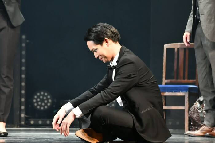 その後、報道陣向けに一部シーン公開が始まると、味方・荒井を筆頭に出演者が長台詞とともに怒涛のハイテンションでパフォーマンスを披露。岡村が自ら「はい、そこまで!」とステージに上がって演技を止めに入り、「これをマスク着けて(稽古を)やってた彼らって、すごいですよね!?」と嬉しげに報道陣に説明していた。