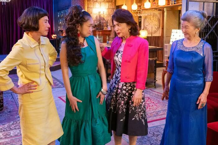 「OLD JACK&ROSE」の名物は、ラインダンス。エリー役の中田喜子、ナマコ役の久本雅美、ひなぎく役の草村礼子の熟女ホステスたちが、軽快な音楽に合わせて、「上、上、上」、「肩、肩、肩」、「猫、猫、猫」と声を掛け合い、キュートな振り付けを披露する。