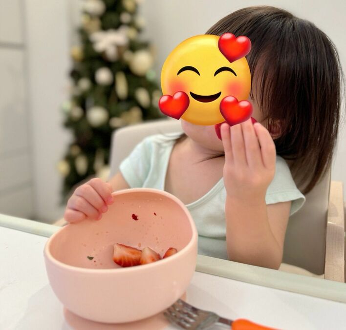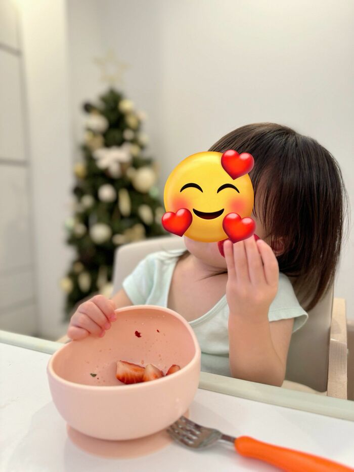 テーブルにはカットされたイチゴの横にフォークが置いてありますが、娘はフォークを使わずに手でイチゴをしっかり持って、首をかしげながらポーズ!大好きなイチゴを食べることができた喜びが伝わってきます。