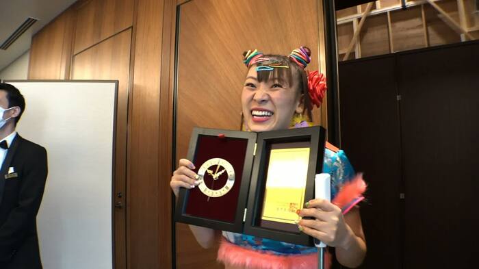 授賞式後、受け取った盾を掲げ喜ぶ彼女に、「スピーチ大丈夫でした?」とスタッフが問いかけると、「スピーチ?大丈夫だったよ」と答え、続けて「あのね、(MCの)おじさんがちょっとキレてた」と笑った。