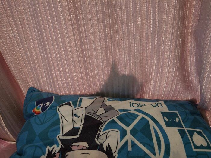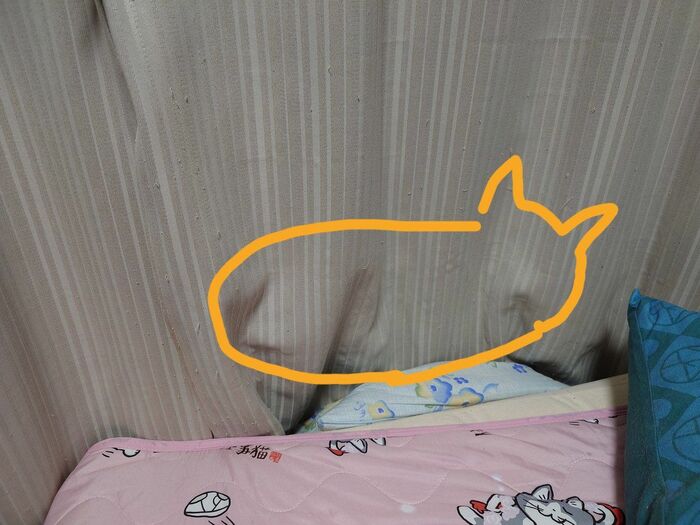 なんとカーテンと窓の間に挟まっています!カーテンの後ろにどうやら支えがあるようで、絶妙なバランスを保っています。