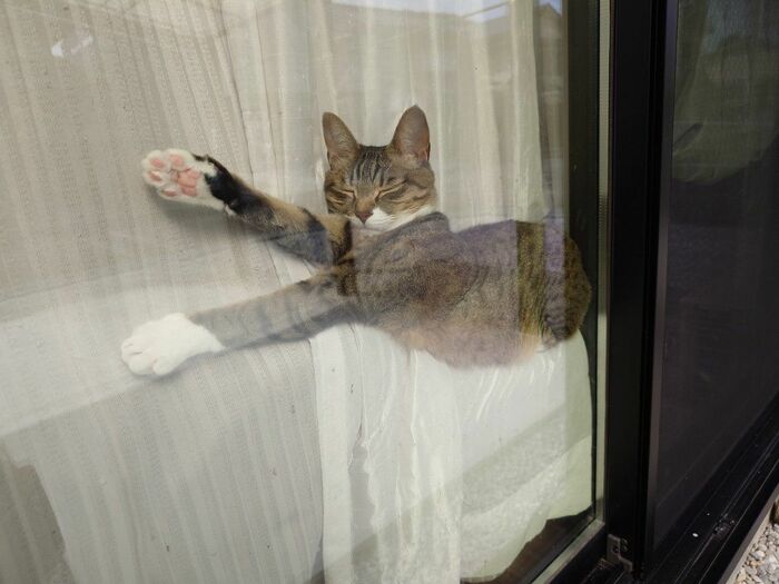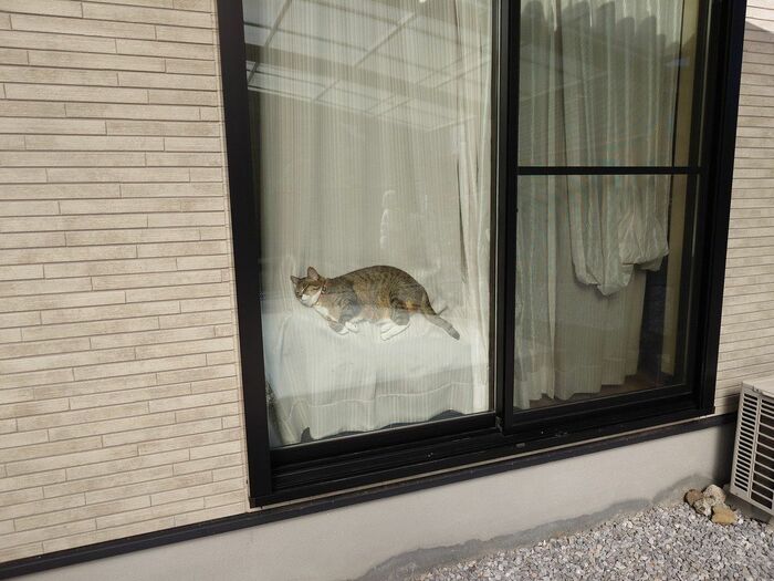 外から撮影された写真を見ると…ん?わらびちゃんが浮いてる…!?足を曲げて、部屋の中で飛んでいるように見えますが…