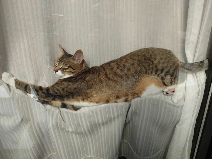 別の日に撮影された写真では、ピンクの肉球が見えた手をびよ~んと伸ばしたまま、寝ていたり…