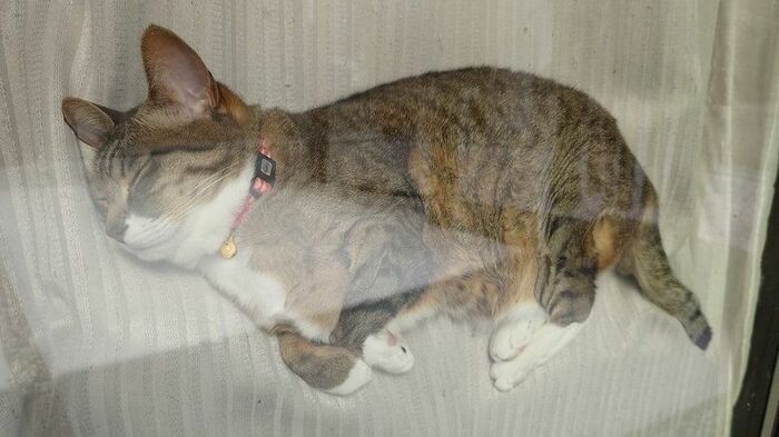 飼い主によると「夏の間は一切やらず、少し肌寒くなってきた頃からここへ潜り込んで昼間のおひさまを浴びるようになりました」とお気に入りの昼寝スポットだといいます。