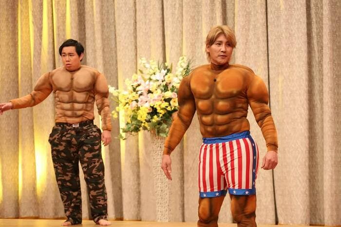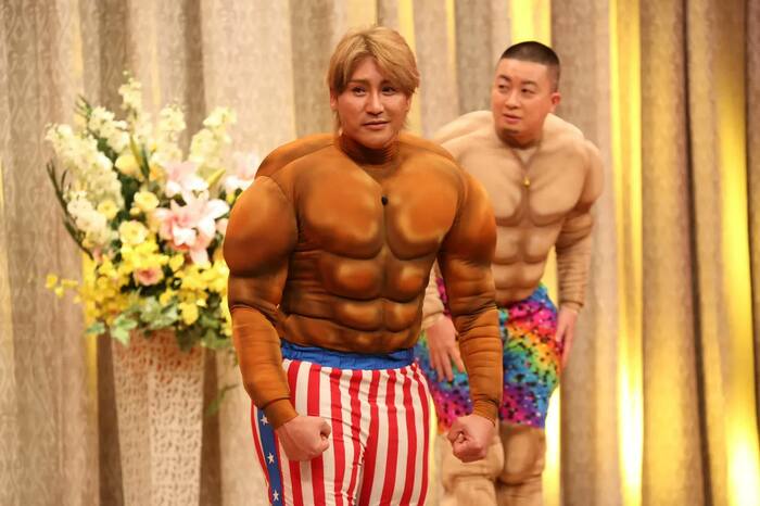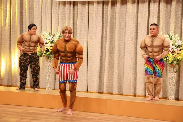 さらに、コントだけではなく「全日本ボキャビルダー選手権」と題し、マッチョなボディビルダーキャラにふんしたメンバーが、リズムに合わせて語彙(ごい)力を競い合うゲーム企画も。