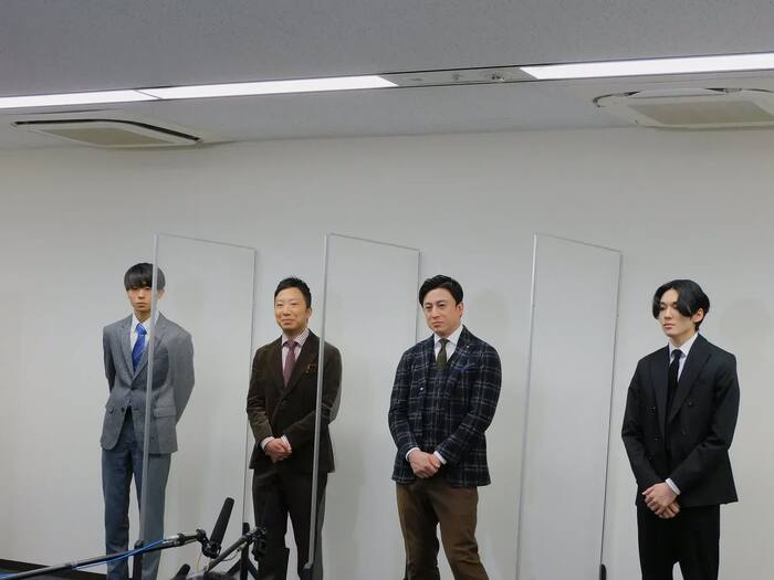 会見終盤には公演を終えたばかりの幸四郎の長男・市川染五郎、中車の長男・市川團子も駆けつけた。今回の不良役について聞かれた染五郎は、「不良役をやったことはないので、自分でいろいろアクセサリーを用意したりして考えました。でも、どこか少年らしいところもあってそこは変わってないなと思って演じました」とコメント。