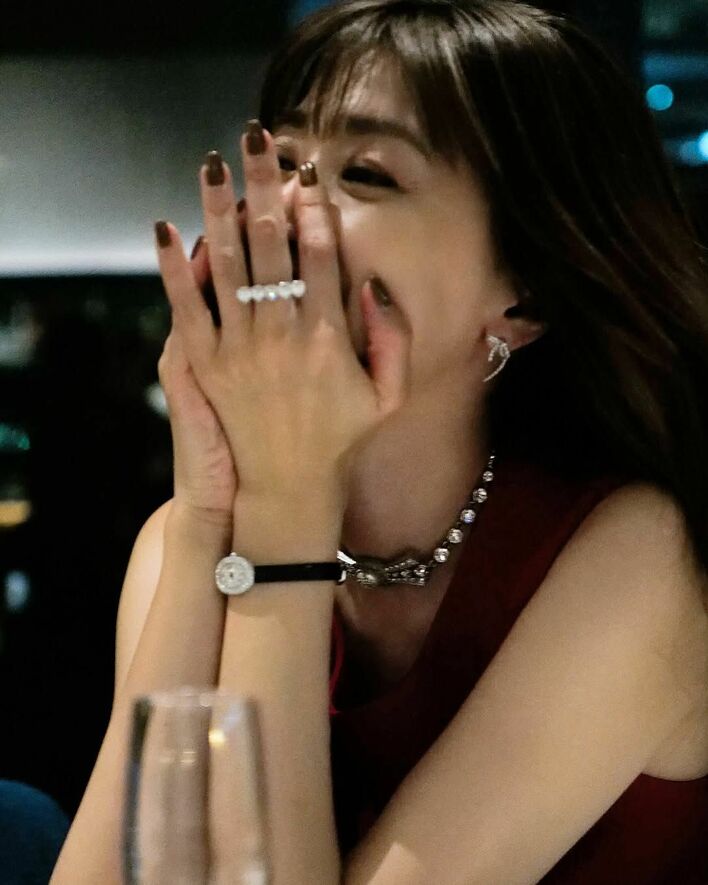 ノースリーブの赤いドレスを着たヨンアさんが手で口を覆いながらほほ笑んでいる姿。