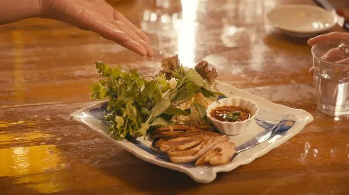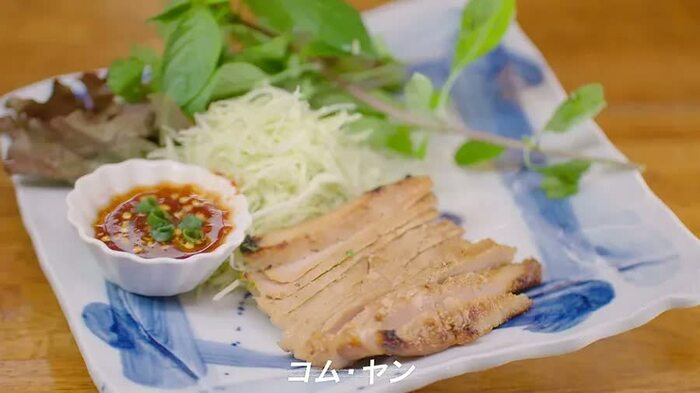 及川さん:お待たせしました。コム・ヤンです。SOI 7スタイルなのですが、このホーラパーというタイのハーブと野菜と豚トロと一緒に召し上がると、すごく爽やかでおいしいです。
