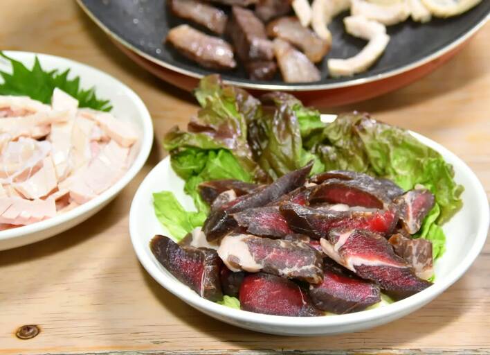 「牛肉の干し肉」について山本さんは、昔からある郷土料理で、ブレンドした塩を牛肉にもみこみ、天日干しすることで旨みが凝縮すると説明。「保存食として食べられていた」と、その歴史も明かした。