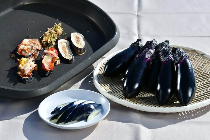 まずはポットプレートの上に斜め切りしたなすを並べ、火を通す。松岡が「よく考えましたね」と、そのアイディアを褒めると、千江美さんは子どもに食べさせるために考えたと話す。