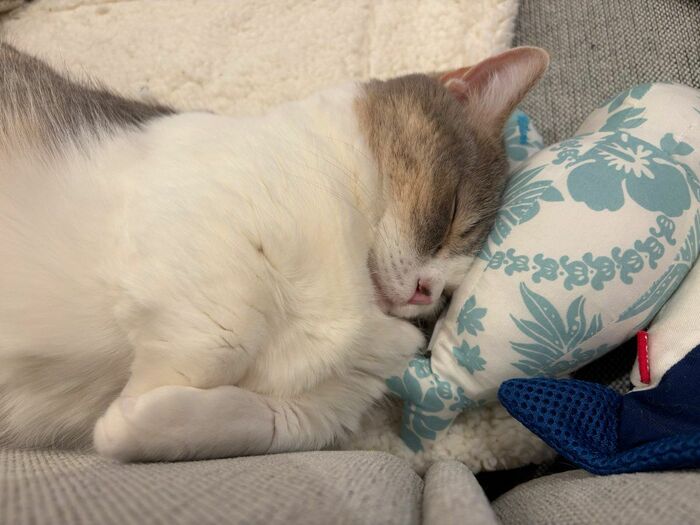 クッション頭を投げ出し、眠る姿も。ふわふわした毛並みになんとも癒やされます。