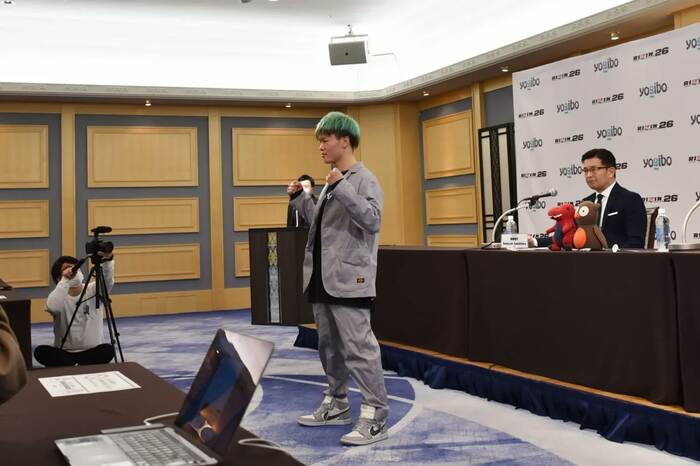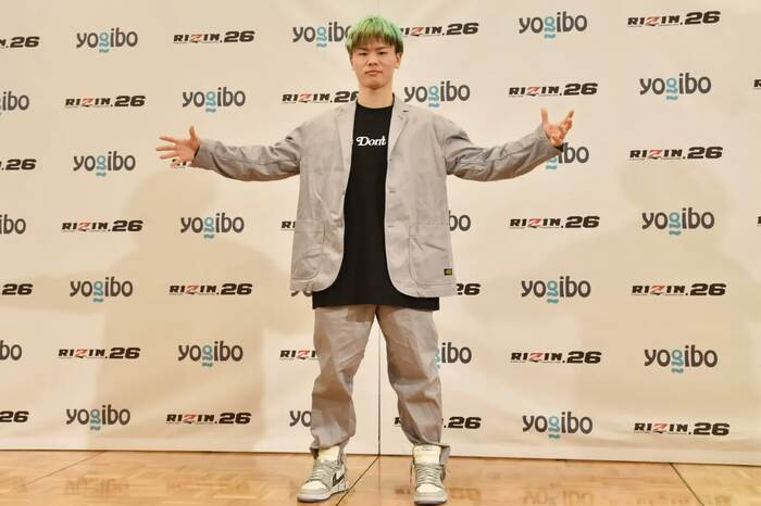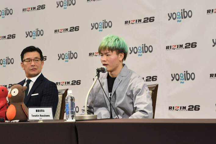 天心選手はセットアップとスニーカーというスタイルで登場し、髪の毛はグリーンに染められていた。マイクを手にすると、「お待たせしました。大晦日=那須川天心。しっかり盛り上げて、一年の集大成としてRIZINと格闘技を締めくくりたい」とコメント。