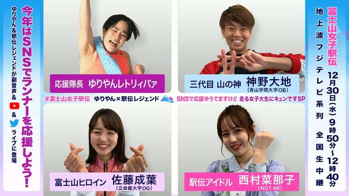 さらに、 “三代目山の神”ことプロランナーの神野大地、富士山女子駅伝OGの佐藤成葉(さとう・なるは/立命館大~資生堂RC)、駅伝アイドル・NGT48西村菜那子の参加も決定。