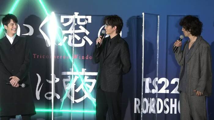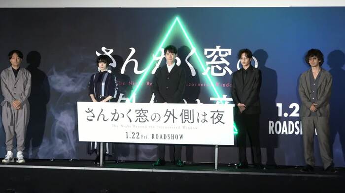 12月15日(火)、映画「さんかく窓の外側は夜」の完成披露試写会舞台挨拶に、岡田将生、志尊淳、平手友梨奈、滝藤賢一、森ガキ侑大監督が登壇した。