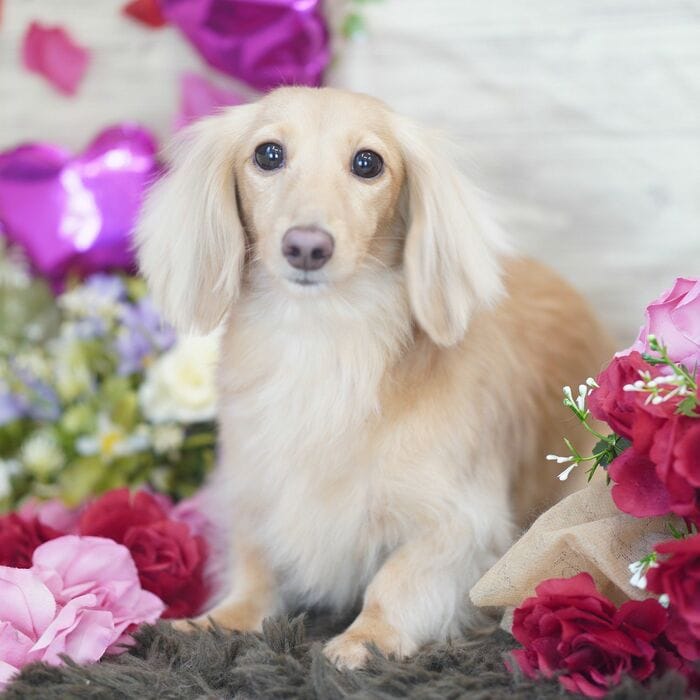 お花に囲まれてカメラに目線を送るのは、ミニチュア・ダックスフンドの「ちゃちゃ」ちゃん。3歳の女の子です。