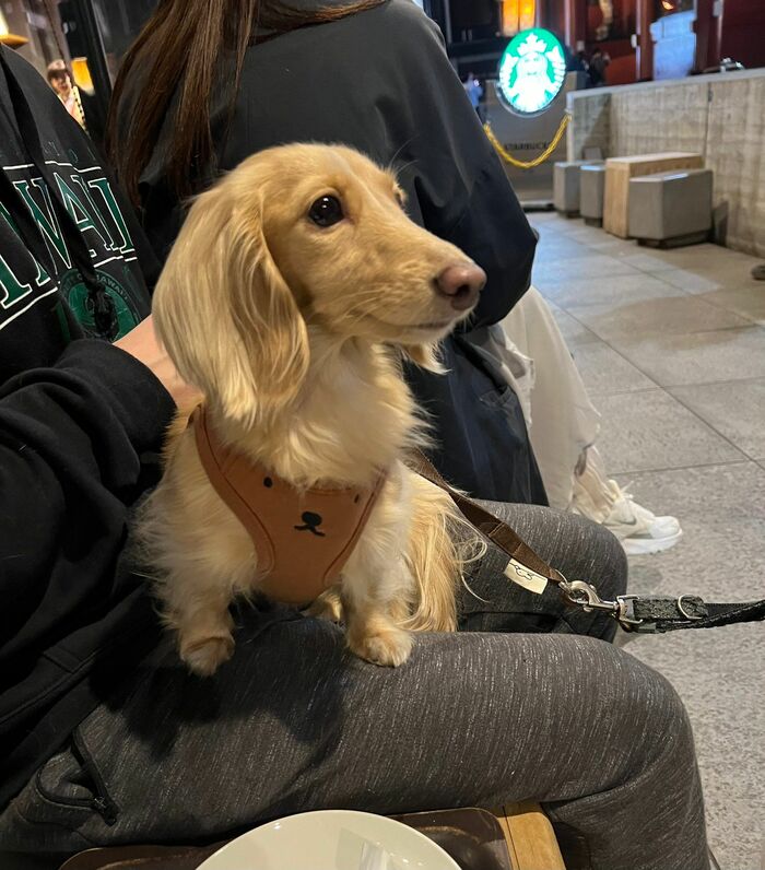 おでかけした時は、飼い主さんのひざの上にちょこんと乗ってくつろぐのが好きなんだそう。