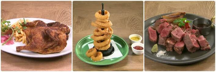 (左から)豪快!丸ごとビアチキンのロースト(1羽/2480円)、オニオンリング (780円)、ホルモンフリーブラックアンガス牛リブロース ヒマラヤステーキ(450g/4800 円)※すべて税込