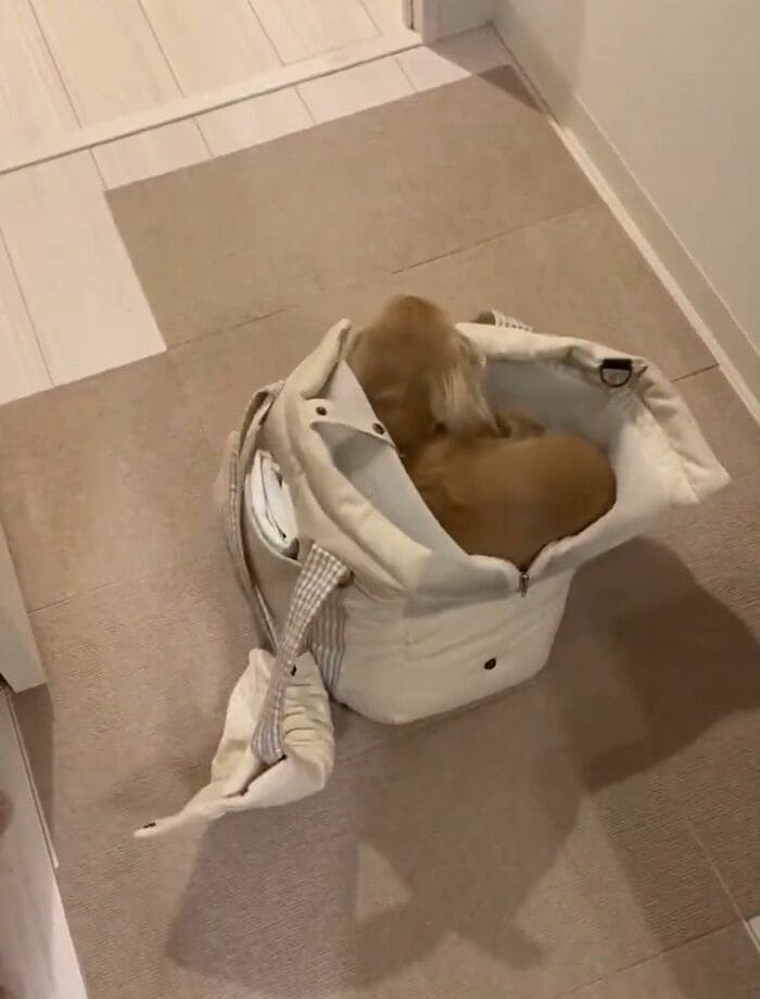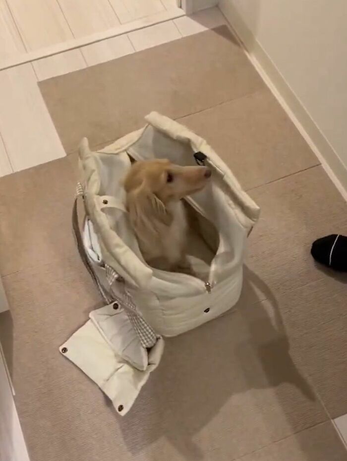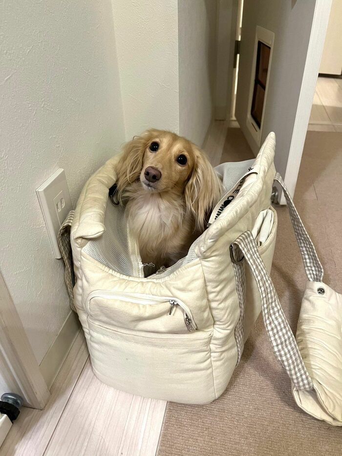 飼い主さんによると、「ちゃちゃ」ちゃんが入った白いカバンは、わんちゃん用のおでかけバッグだそうで、カフェなど少し遠くに行く時に、いつもこのバッグに入っておでかけをするそう。