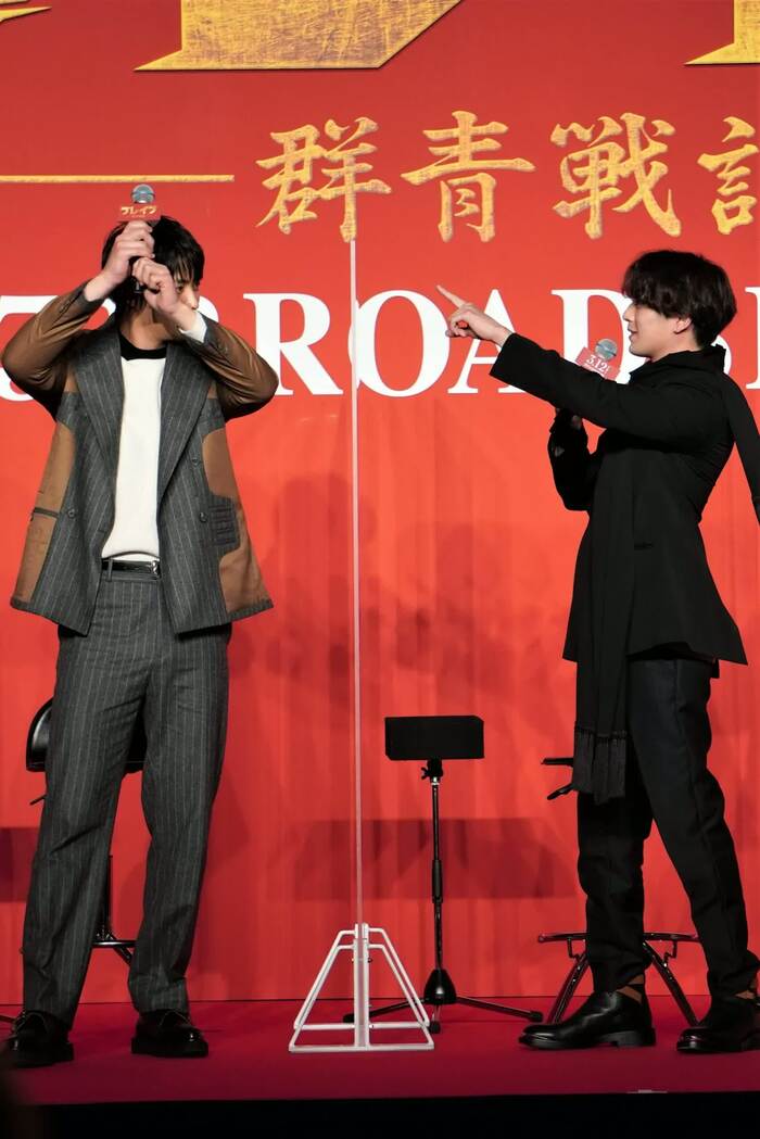 劇中、気弱な蒼役を演じた新田は、全員のリーダーで、蒼の幼なじみの考太役を演じた鈴木の裏に隠れていることが多く、特に木刀を持って戦うシーンでは高身長の鈴木がさらに大きく見えると言い、実際にその場に鈴木に立ち上がってもらって、シーンを再現。「身長が3メートルくらいになる(笑)」と言い、その後ろに隠れられるので一緒にやっていて「すごく安心しました」と笑顔で語った。