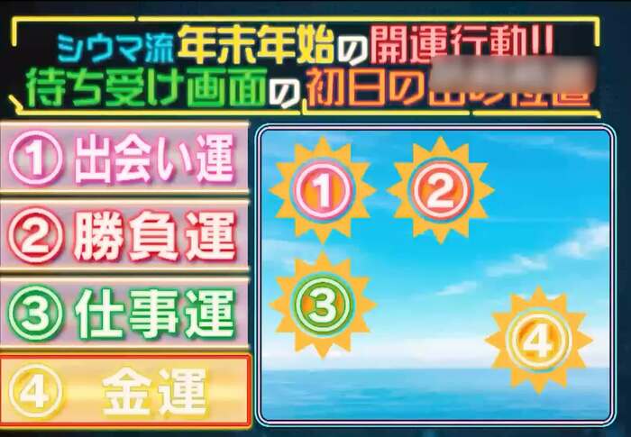 琉球風水志・シウマが解説したのは「待ち受け画面用の初日の出の撮り方」。初日の出を撮る位置によって叶いやすい願い事が変わってくるという。詳細は画像のとおり。もし元旦に写真が撮れなくても、新年に自分が初めて見る日の出を撮影すればOKだそうだ。