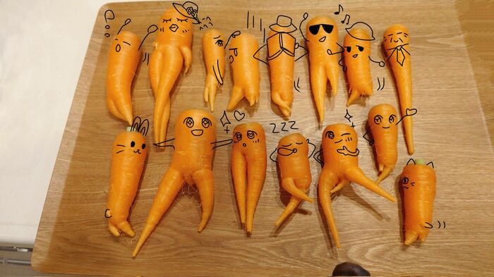このイラストを描いたのは、K.あや ウェディングドレス手作り中♩さん。個性的なニンジンがたくさんあって面白いなと思い、この子たちに顔があったらこんな感じなのかな?とイメージがわいてきて顔を描きたくなったんだそう。
