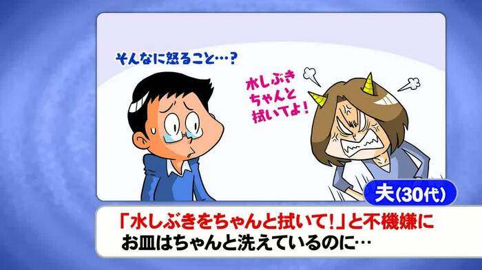 また、「せっかく皿洗いをしたのに、水しぶきを拭いていないからと妻が不機嫌になる」という30代男性のエピソードでは、「そんなことを言われるなら、皿も洗いたくない!」という庄司と、「放っておいた水しぶきを毎日拭いているのは妻。そもそも“やってやった”という態度が腹が立つ」という千秋が口論に!
