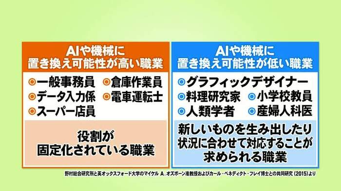 現在、金融業界などでは、人間とAIの分業が進み、今後、他業種でも一般事務職などの役割でAIへの置き換えが進むと考えられている。三木によると「AIが小説を書いたりする例もある」そうで、リンゴは「中国では、アナウンサーもAI化している」と説明。