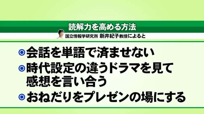 家庭でも、「会話を単語で済ませない」「(現代とは違う言葉や設定が使われる)時代設定の違うドラマを見て感想を言い合う」などの方法で、読解力を伸ばすことができるのだそうだ。