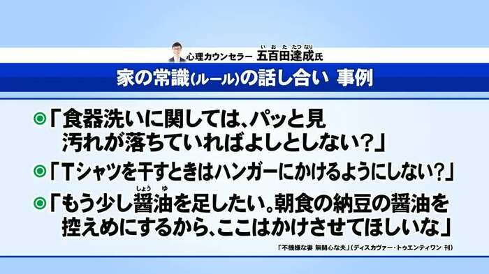 心理カウンセラーの五百田達成(いおた・たつなり)氏によると、そういう時は「相手を他人だと思うのが和解への近道」なのだそうだ。三木も「ホームステイに来ている留学生だと思えばいいのでは?」と提案したが、リンゴは「そんな人のパンツは洗えない!」と混ぜっ返しながら、家族だからこその距離感の難しさを指摘した。