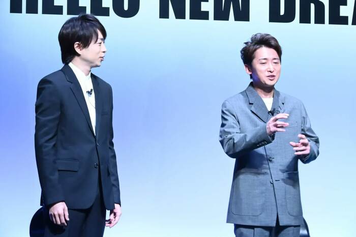 まずは櫻井翔のあいさつをきっかけに、5人が声をそろえて「嵐です」と自己紹介。櫻井が「本日は僕たち嵐、そして、13社の企業の皆さまと合同で実施している『HELLO NEW DREAM.PROJECT』の総括をお伝えするために、会を催させていただきました。さっそくですけど松本くん、総括をお願いします」と、進行役に松本潤を指名した。