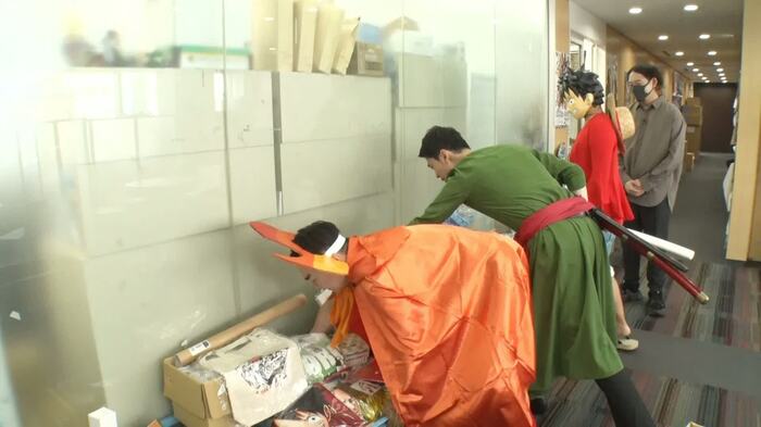 集英社には、来客が自由に持って帰ってもいいというワンピースグッズが山のように置いてある場所があるというウワサを聞きつけた、かまいたち。これからお世話になるであろう方々にグッズを配る目的で、ジャンプ編集部の入り口付近にある、お宝がザクザクあるというウワサのスポットへ。