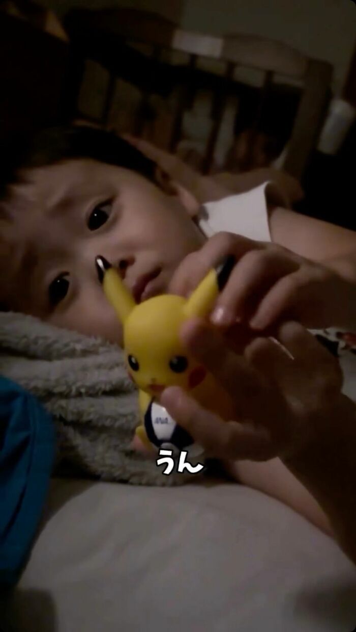 すると けいとくん、「これで遊んで」とピカチュウの人形をパパに差し出します!