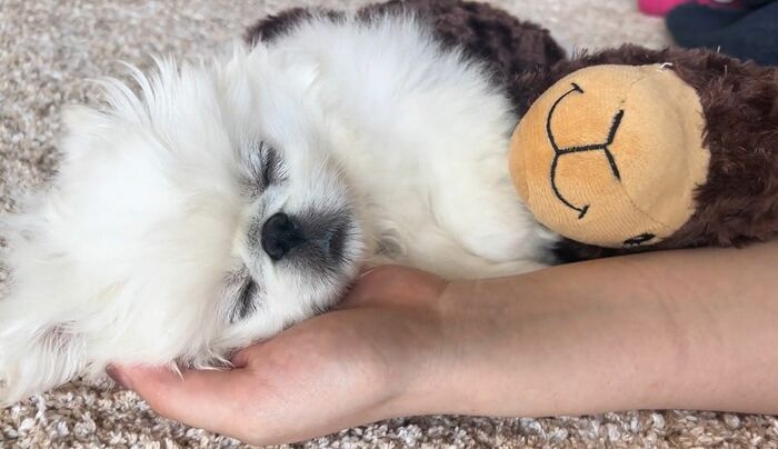 そして、元気いっぱい遊んだ後は、飼い主の手の上に頭を乗せて、お気に入りのぬいぐるみとすやすや…