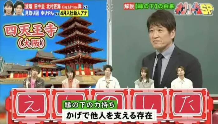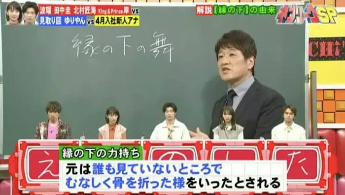 「縁の下の力持ち」という言葉を答える問題では、林修先生が解説を加えてくれた。陰から他人を支える存在を指すこの慣用句は、大阪の四天王寺の経供養という法要に語源があると言われているという。