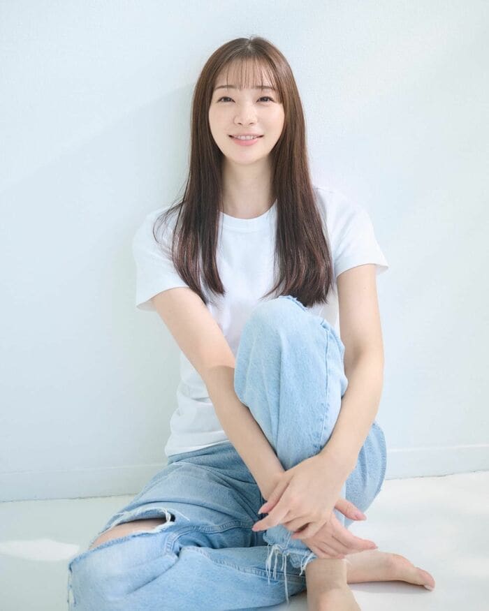 白いTシャツにライトブルーのダメージデニム姿で片膝を立てて座り、優しくほほ笑むショットや…