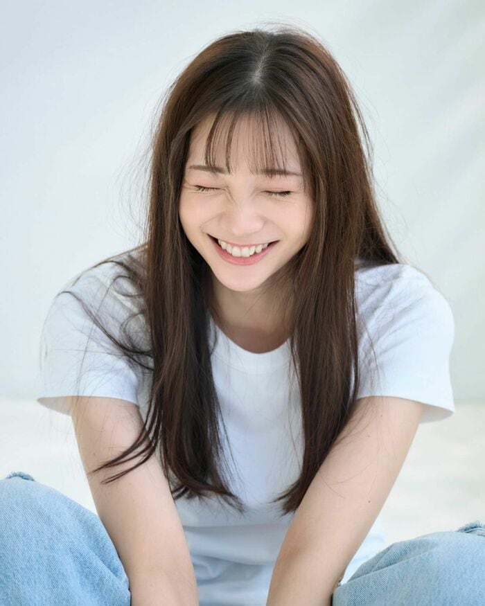 顔をくしゃっとさせて笑顔を見せる姿を公開。飾らずナチュラルさが溢れています。