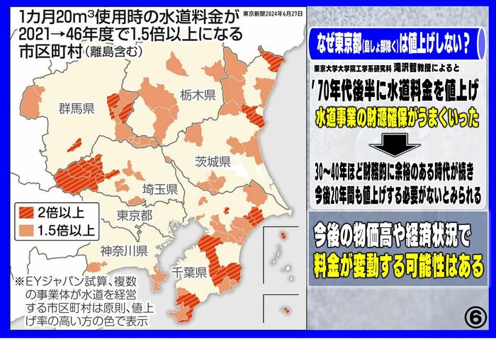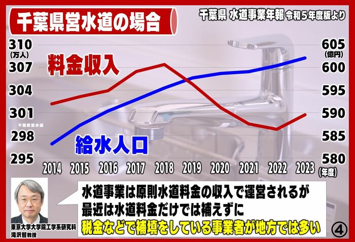 東京大学大学院工学系研究科・滝沢教授によりますと、「水道事業は原則水道料金の収入で運営されるが、最近は水道料金だけでは補えずに税金などで補填をしている事業者が地方部では多い」とのことです。