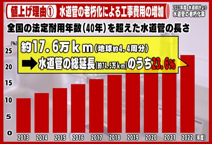 では、なぜ今こうした値上げが全国で相次いでいるのか? 1つ目の理由は「水道管の老朽化による工事費用の増加」です。