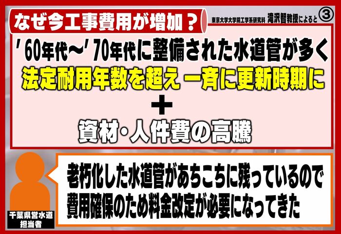 千葉県営水道の担当者を取材したところ、「老朽化した水道管があちこちに残っているので、費用確保のため料金改定が必要になってきたとのことなんです。