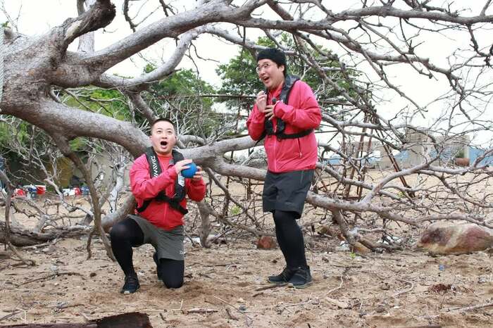 さっそく、砂浜に打ち上げられたゴミや流木などネタになるものを真剣に探す4人。長田&野田チームは、巨大なヤシの木をみて何かひらめいた様子。そして、双方競うように次々とネタを繰り出していく。