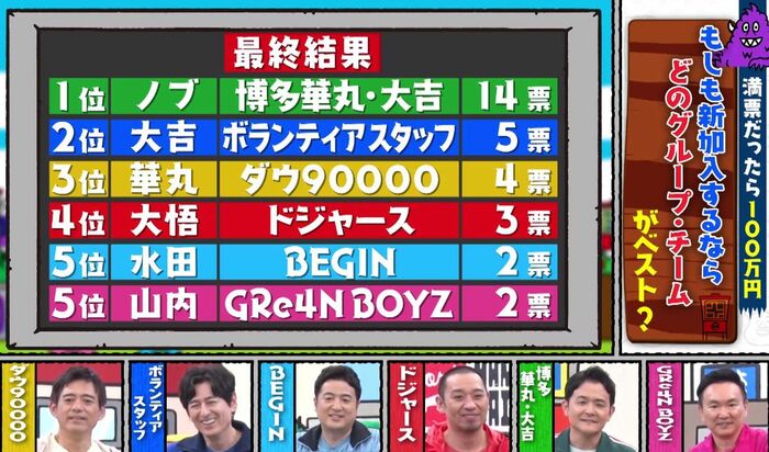 ノブさんの「博多華丸・大吉」に14票が入り、ベストアンサーに!賞金7万円を獲得しました。