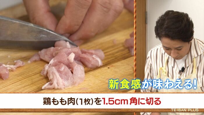 谷原:(肉の)上下を分けて、繊維に沿ってだいたい1cmから1.5cmくらいに切る。このくらいに刻んでいけば、手間もそんなにかからず新食感が味わえるんです!