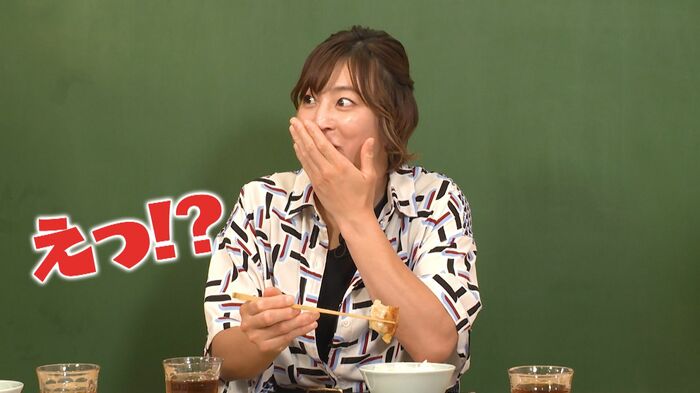 角田:いただきます!ん!?ん!?えっ!?エビみたい。すごい!エビギョーザだ!ヤバい!びっくりした!