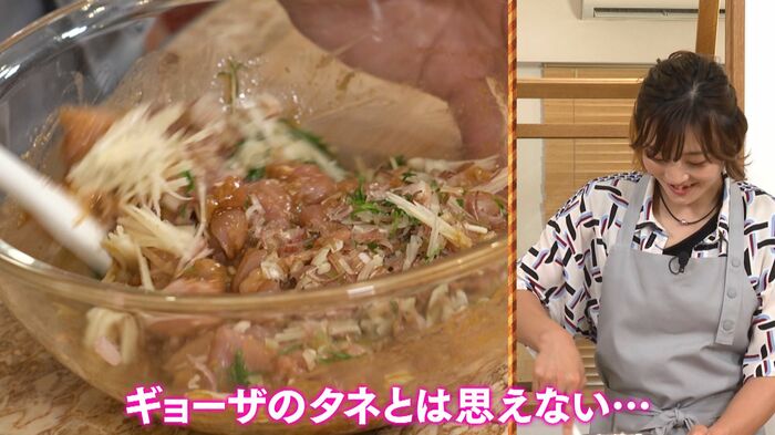 谷原:さあそんな、ギョーザの舌の肥えた角田夏実さんのために私今回ちょっと考えさせていただきましたよ。ずばり!「ギョーザ大好きの夏実も大満足!たくさん食べて大丈夫、ジューシーヘルシーギョーザ」に挑戦をいたします!