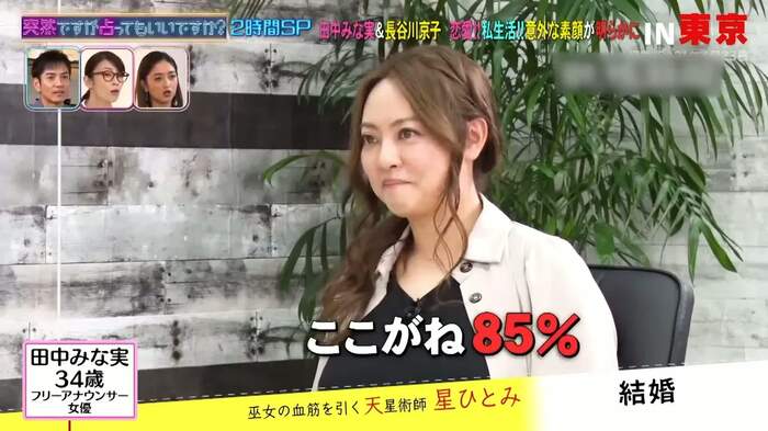 続けて、田中の結婚運に言及した星は「満月、山脈、深夜タイプのなかで、ちょっと優しい感じの人。ここが運命の相手です。来年までには結婚にいけると思います。可能性は85%。40歳までには96%に上がりますから」とズバリ診断。