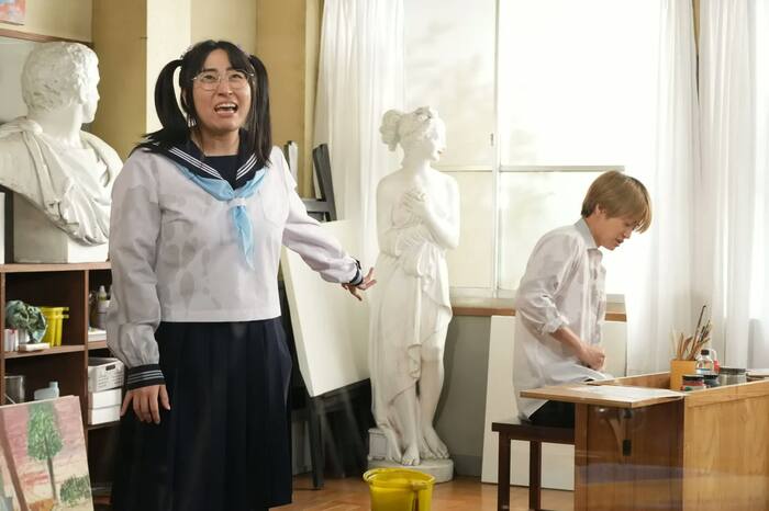 丸山が演じる、アニメ好きのオタク美術部員・井上千晶と、菊池風磨演じる美術部に入りたい生徒が繰り広げる、まか不思議なコント。前回の放送で絵の具の混じった水をかぶってしまった菊池だが、今回はその続きとなっており、汚れたシャツを井上に洗ってもらうため、上半身裸になるところから始まる。