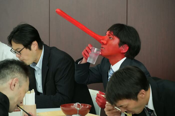 新作コントも続々。秋山が真っ赤な顔に長い鼻をつけた強烈なビジュアルで、淡々とサラリーマン生活を送る「天狗ですみません」。