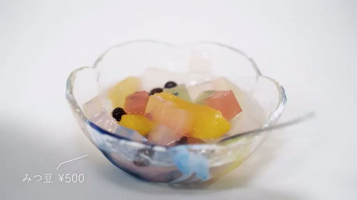 今回のヒロインは、みつ豆(500円)を注文。常連の男性客が注文したお新香盛り合わせ(500円)や、そのほか、たまごサンド(500円)など、幅広いジャンルのメニューを楽しめるのも、この店の魅力の一つだろう。