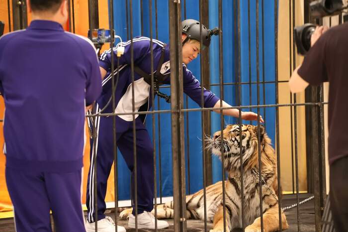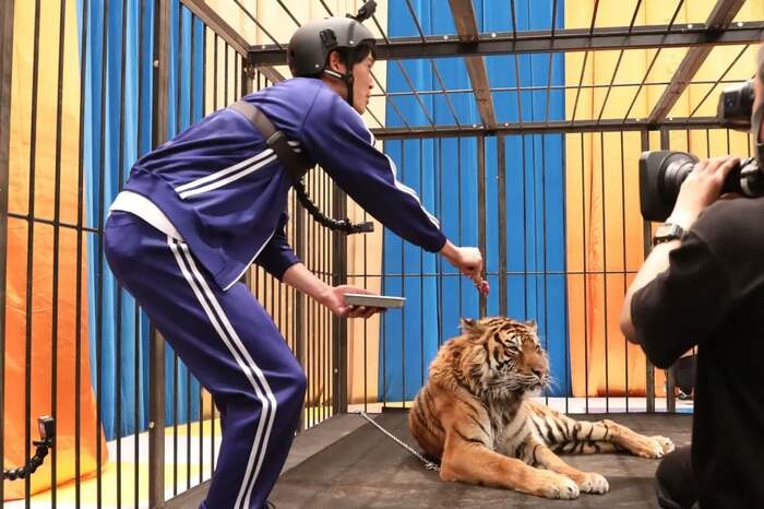 那須川は「トラをなでなでできるのか?」に挑戦。リング上の“神童”の姿はどこへやら、おびえながらトラと接する貴重な姿は必見。